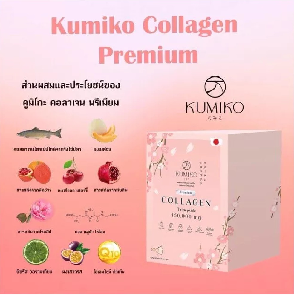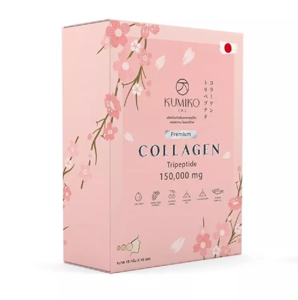 Kumiko Collagen Tripeptide Kumiko Collagen KUMIKO Collagen is a collagen that increases strength. and flexibility of collagen in the skin layer healthy skin from inside to outside With 8 types of skin care extracts, it helps nourish all skin types. Large pores look smaller, prevent blemishes, dark spots, freckles, acne, reduce oiliness, reduce rough skin and improves the efficiency of the circulatory system The skin is more flexible Wrinkles are reduced. scars look faded and the skin is more hydrated and help inhibit the formation of melanin pigment make the skin more radiant Hair and nail care bone and joint repair Adjust the water balance of the joints.