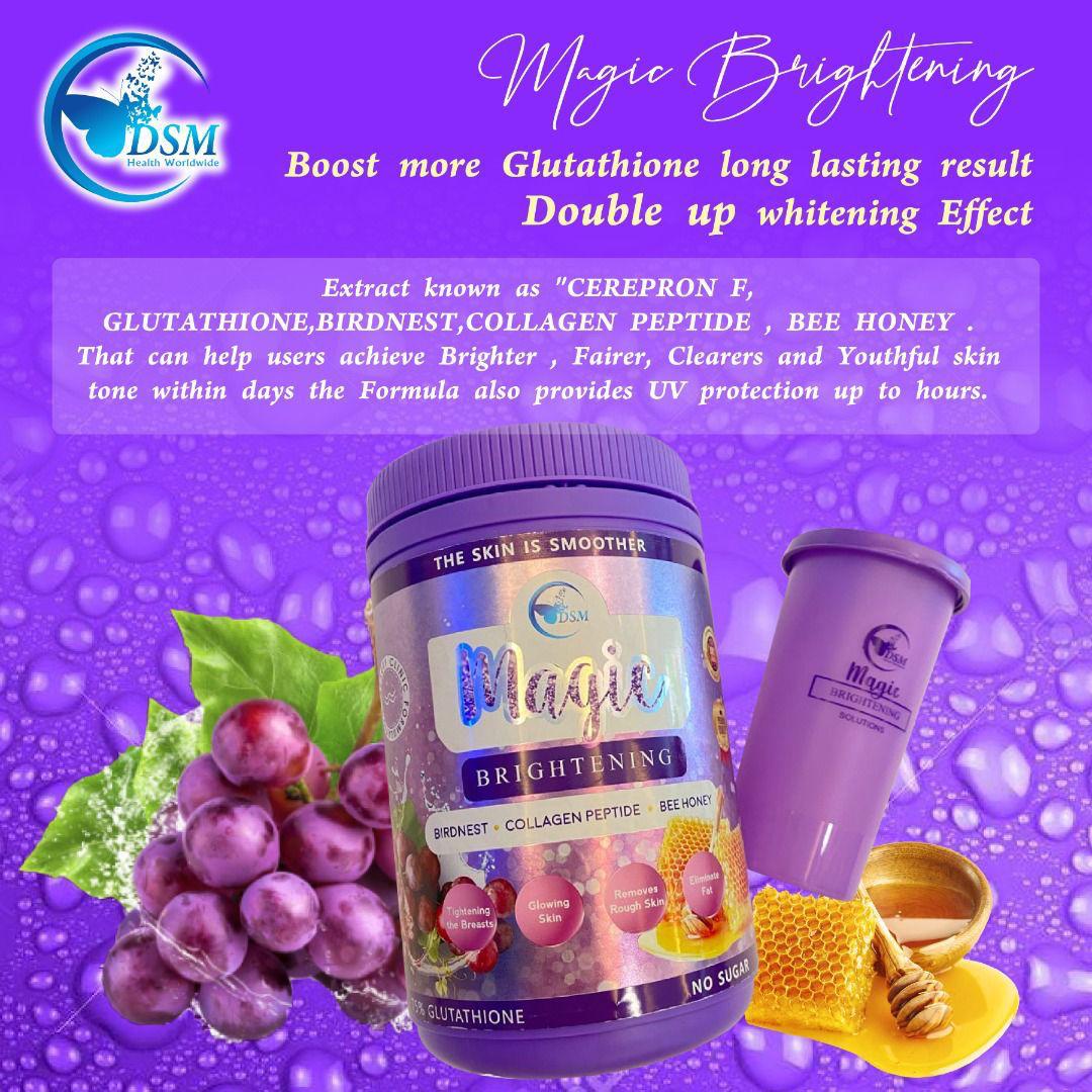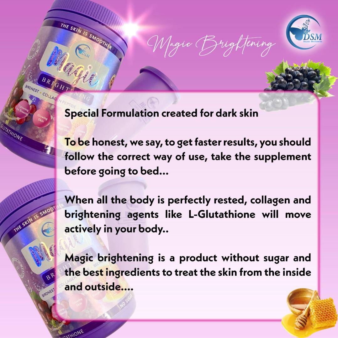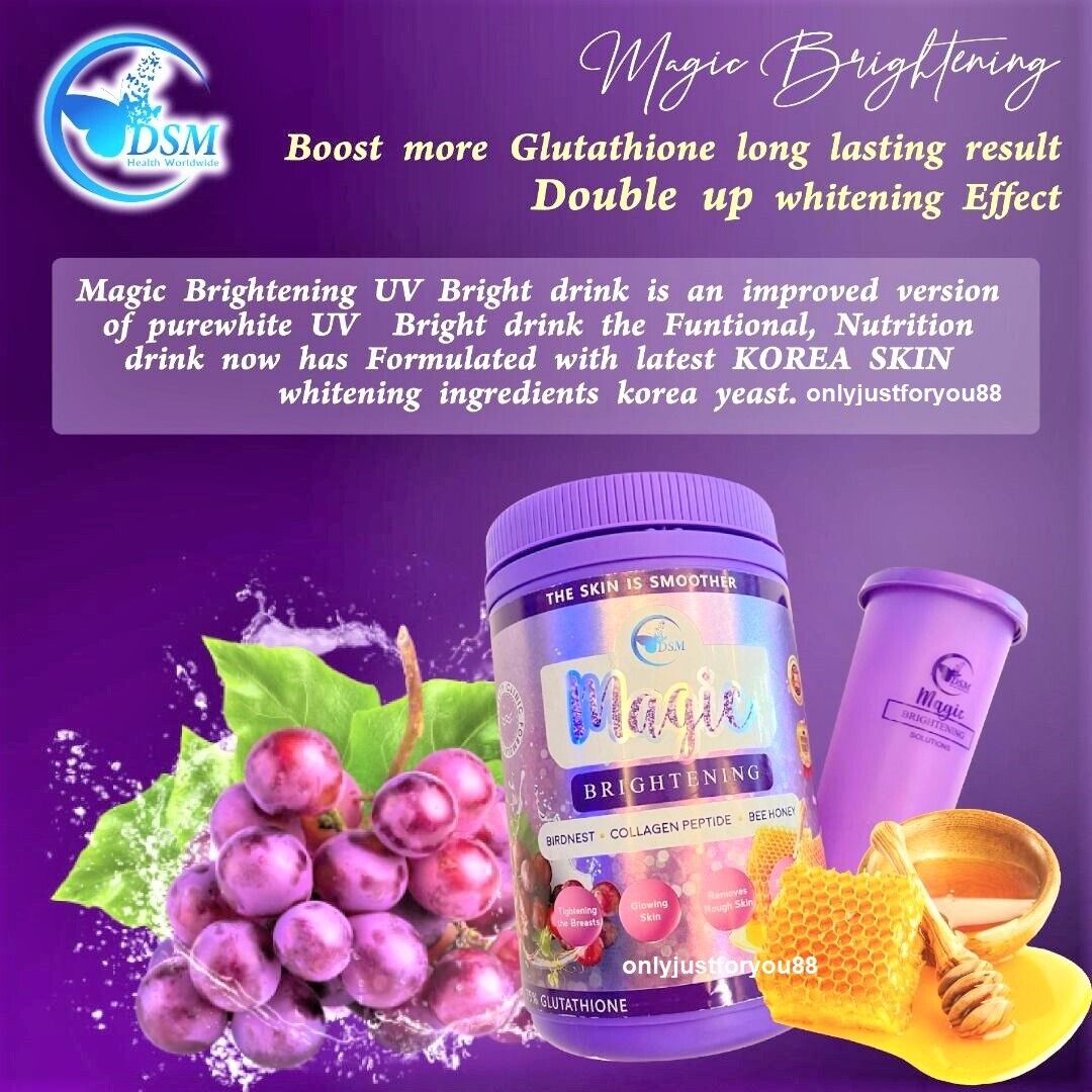 🍌 Magic Brightening UV Brightening Drink is a better version of the pure white UV Bright drink Functional, Nutritional Drink has now been Formulated with the latest *KOREA KOREA* whitening ingredient Korean yeast. Extracts known as “CEREPRON F, GLUTATHIONE, BIRDNEST, COLLAGEN PEPTIDE , BEE HONEY . Which can help users achieve Brighter, Even, Radiant and Youthful skin tone within days. The formula also provides UV protection for up to several hours.